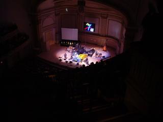 この日の席は、ホールの一番上のバルコニーでした。普通、このような音楽ホールには、リズム系の音楽は適さない(音圧が増すと音が回って混沌としてしまう)とされているので、あまり期待は出来ないものなのです。しかも私が座っていたバルコニー席は、見晴らしは良いけど殆んどの場合、音はイマイチな場合が多い。
